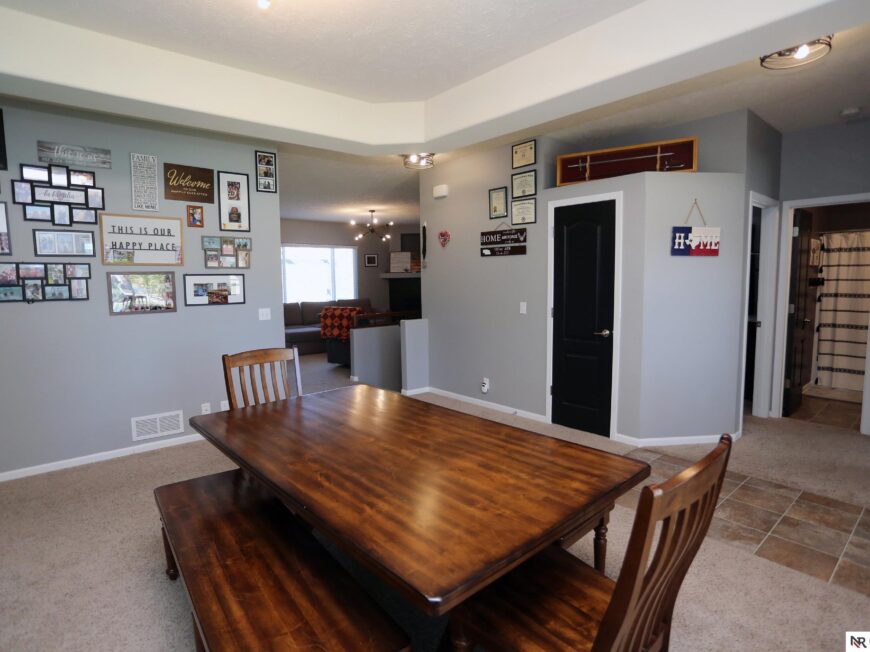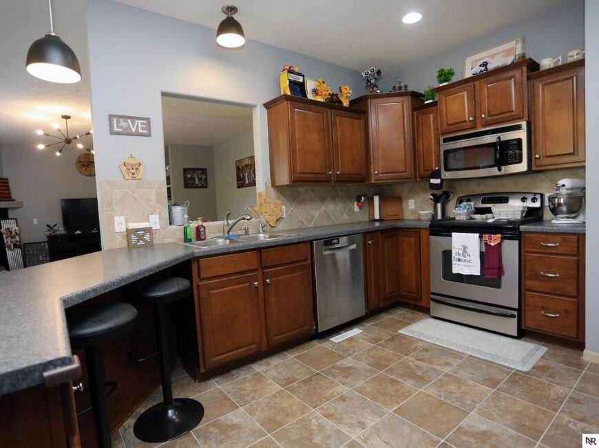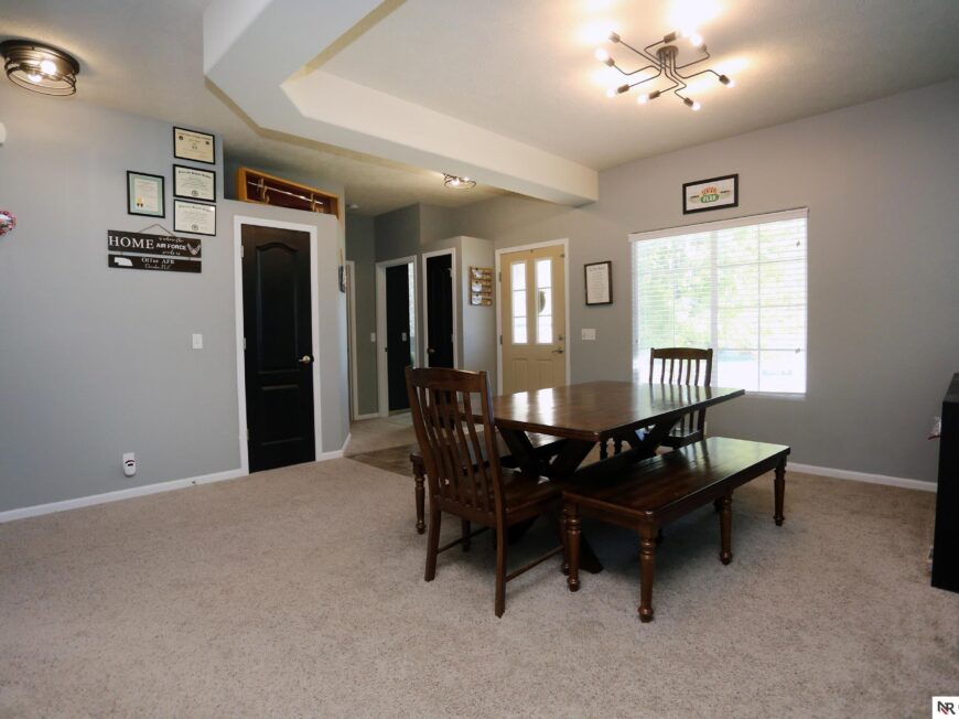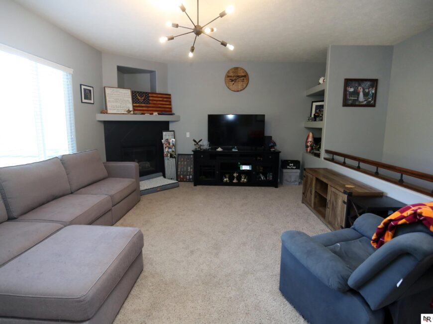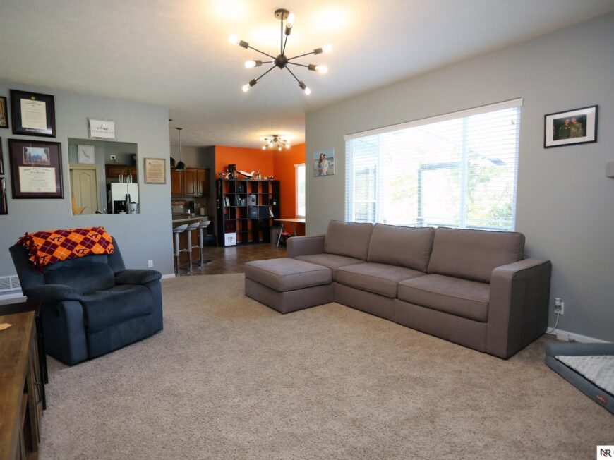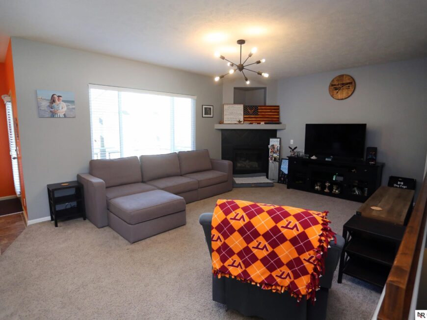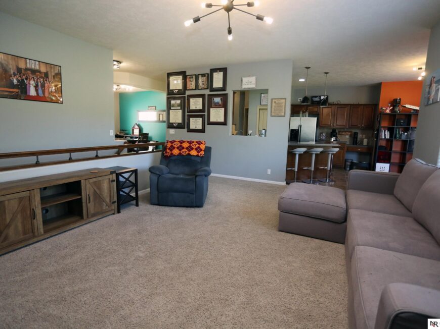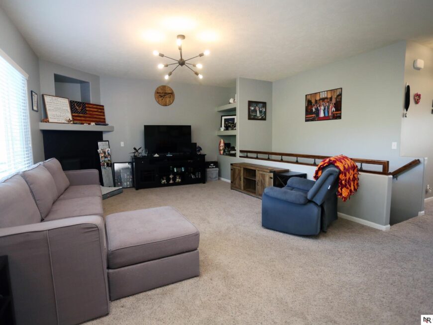 No back yard neighbors at this immaculate, move-in ready walkout ranch in popular Williamsburg! Originally built by Celebrity Homes in 2010, this large ranch with an open floor plan, modern kitchen, split-bedroom layout, and finished basement is ready for a new owner to love. Great curb appeal, lush lawn, low traffic, and conveniently located. The main floor includes a large great room with cozy corner fireplace, open kitchen with dark wood cabinetry, 2 bedrooms and a main bath on one side of the home, and a spacious primary suite on the other side. Finished walkout basement adds a large rec room, a unique playroom with built-in rock walls, and tons of additional storage space. Large deck with overhead structure overlooks a flat back yard backing to trees – providing amazing privacy and tranquility. Terrific location just 2.5 miles/5 minutes from Offutt AFB, with quick access to HWY 75. All appliances included! Potential VA Loan assumption for qualified veterans.